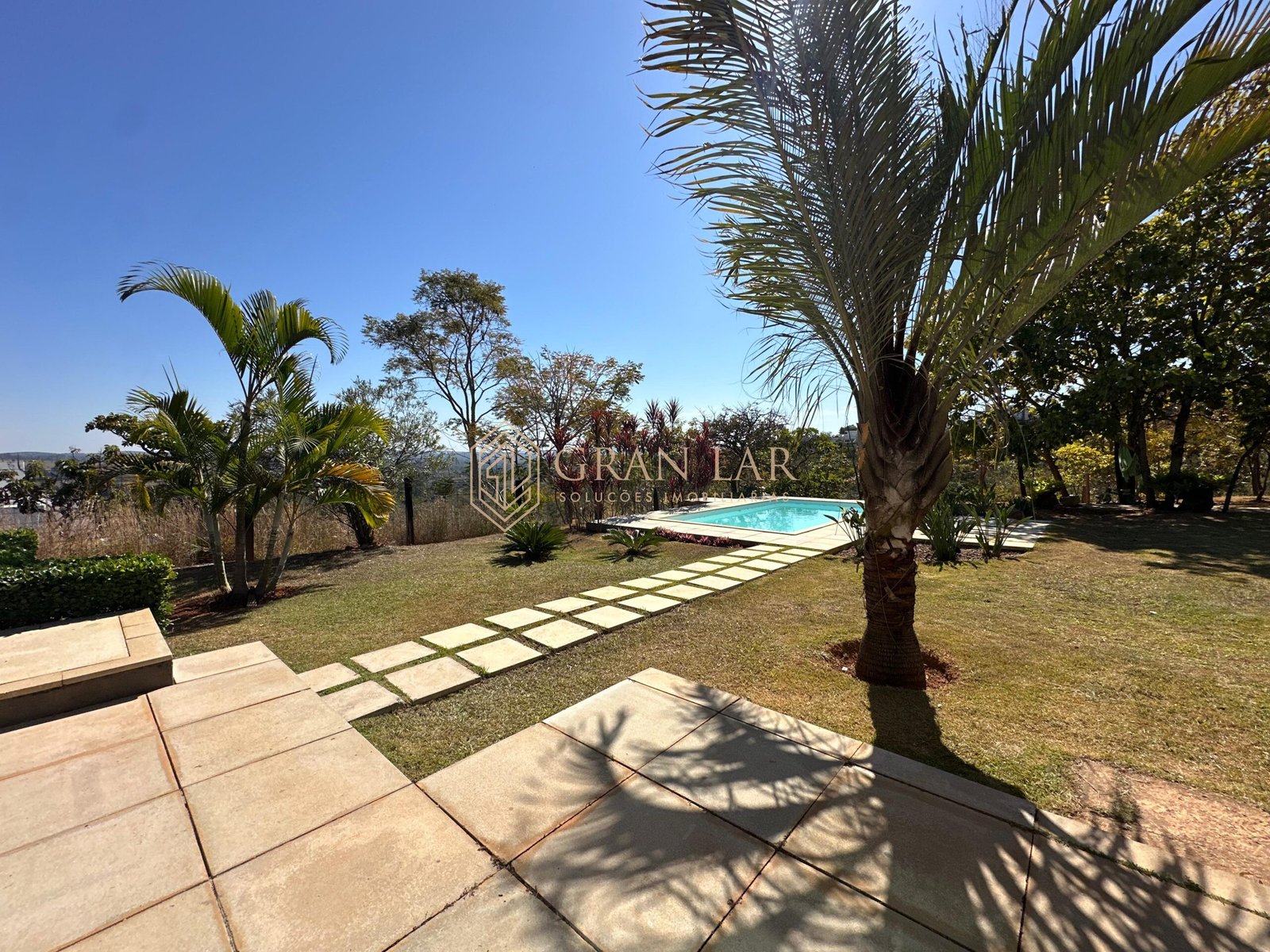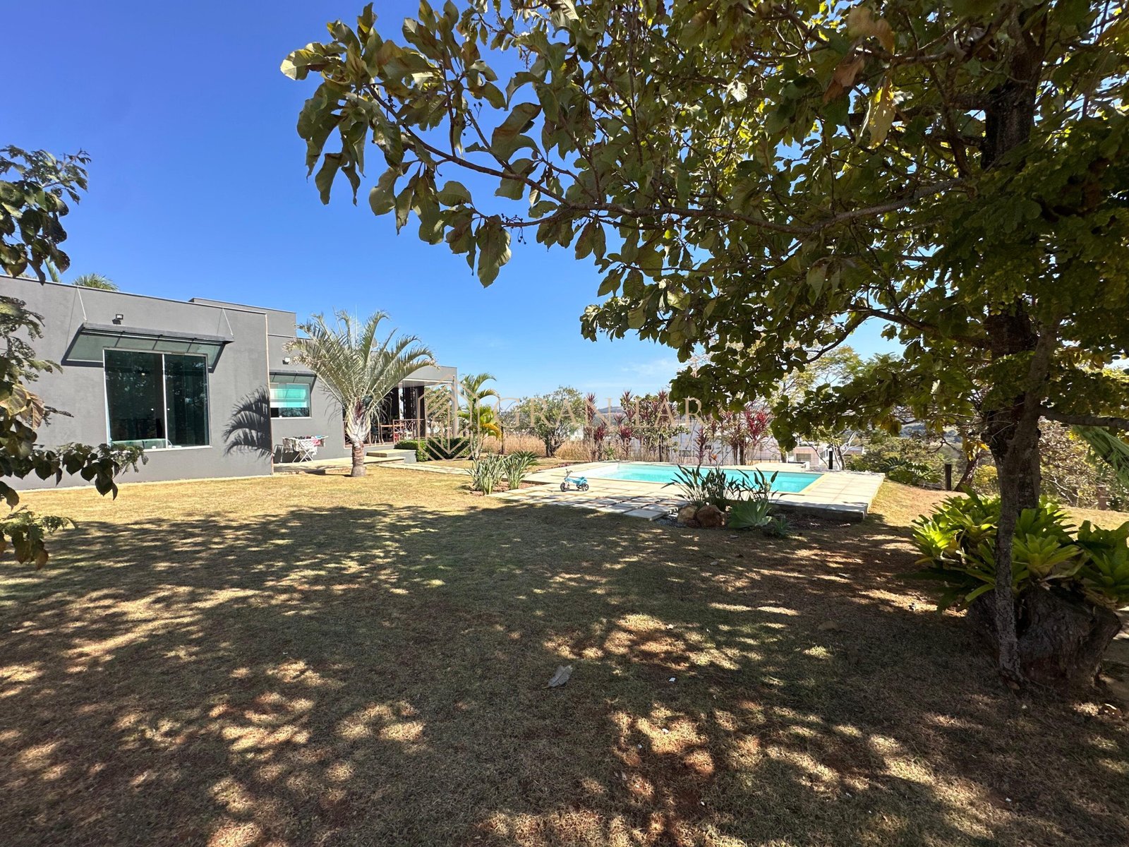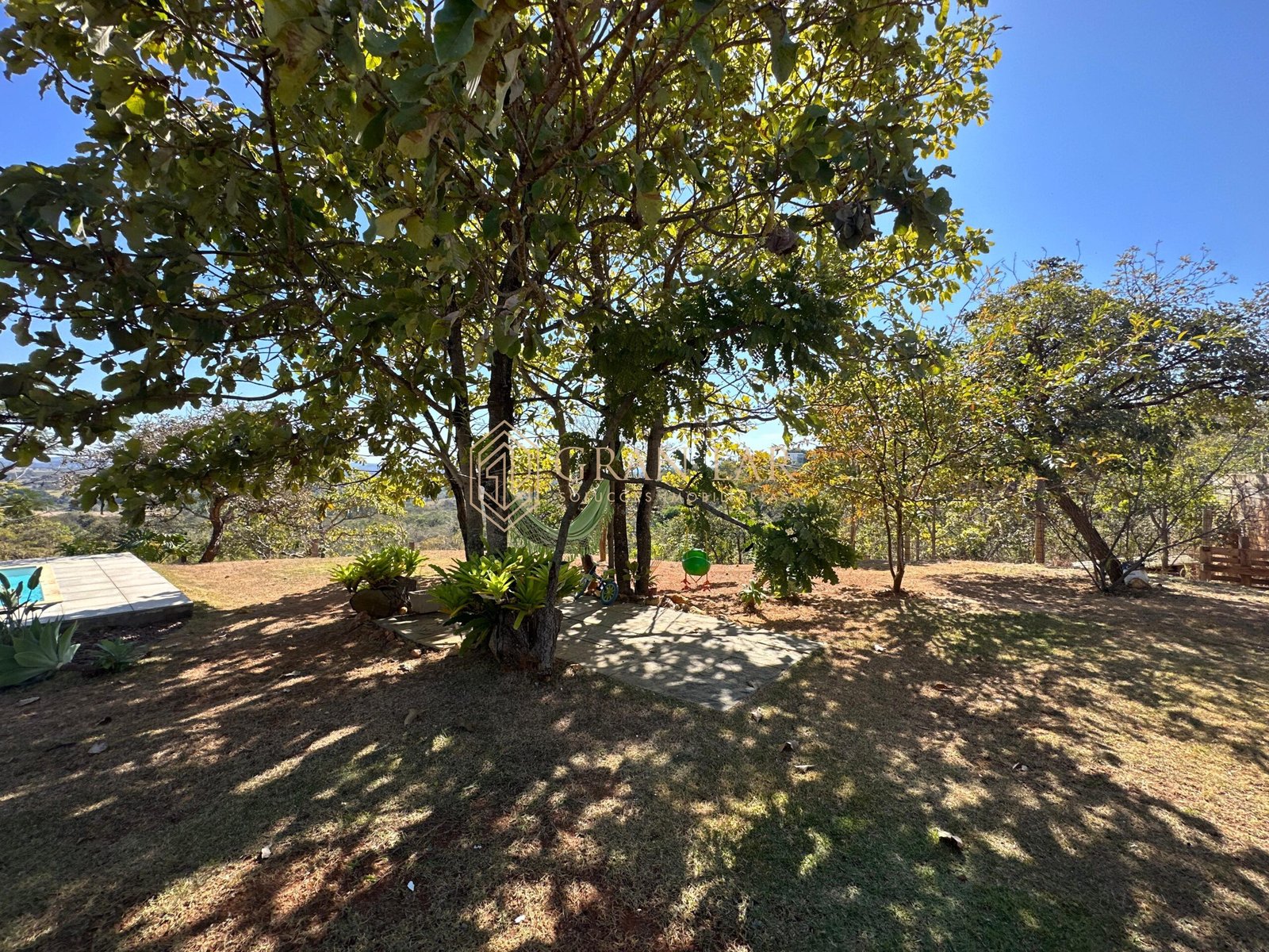 Na área externa quintal gramado com pomar, paisagismo e piscina.
